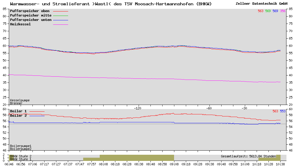 Wenn Sie einen Einblick in die aktuellen Daten des Blockheizkraftwerkes haben wollen: http://www.tsvmoosach/BHKWerk. Sie sehen die Temperaturen der beiden Boiler, des Pufferspeichers im oberen / mittleren / unteren Bereiche sowie de Status der Pumpen.
